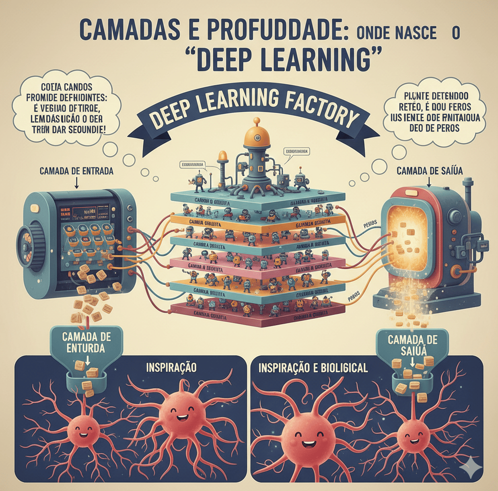 Já ouvimos o termo "Deep Learning" (Aprendizagem Profunda), mas o que é que isso significa realmente? No artigo anterior, vimos que uma rede neural tem neurónios conectados. Quando organizamos estes neurónios em muitas camadas, uma em cima da outra, criamos uma rede "profunda". A profundidade é o que permite à IA compreender conceitos complexos em vez de apenas dados brutos.