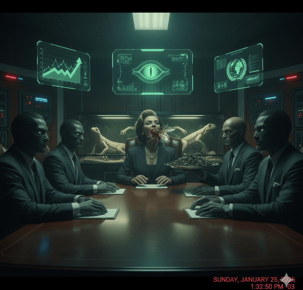 Os reptilianos alimentam-se de "Loosh", que é basicamente a energia do nosso medo e sofrimento. É por isso que os telejornais só dão notícias más; é para cozinhar o jantar dos nossos senhores lagartos. Eles adoram uma boa crise geopolítica porque o aroma a desespero humano é o equivalente ao tempero de churrasco para eles.
